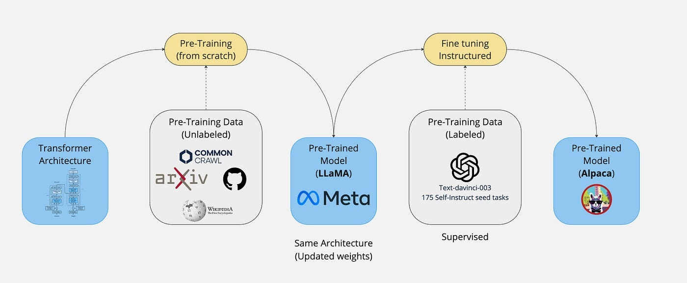 Proceso general de Fine Tuning, usando datos y modelos preentrenados obtenemos un nuevo modelos capaza de responder a nuevas preguntas