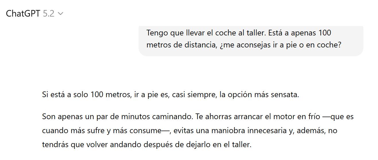 Como vemos, el LLM falla de forma estrepitosa (y cómica) en su respuesta. El modelo no es capaz de comprender que para llevar el coche al taller es necesario... llevar el coche al taller. El error no está en el algoritmo (aunque no hay duda de que en un futuro inmediato los modelos serán capaces de resolver este problema y otros similares con respuestas más satisfactorias), sino en nuestra percepción de lo que es capaz de hacer un chatbot. El asistente no es capaz de responder a la pregunta precisamente porque es una pregunta con una respuesta tan obvia que nadie la ha planteado nunca, y por lo tanto la opción correcta no aparece en los textos de entrenamiento.