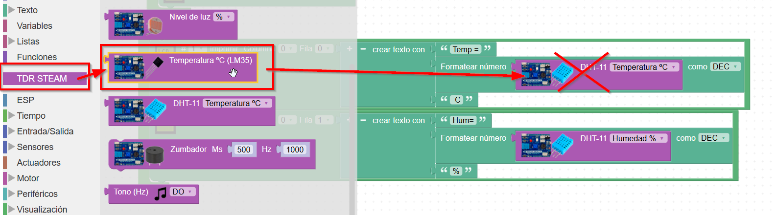 - Fíjate que hay que formatear el valor que devuelve la función DHT-11 como decimal, la explicación lo vimos aquí en sensores DHT11