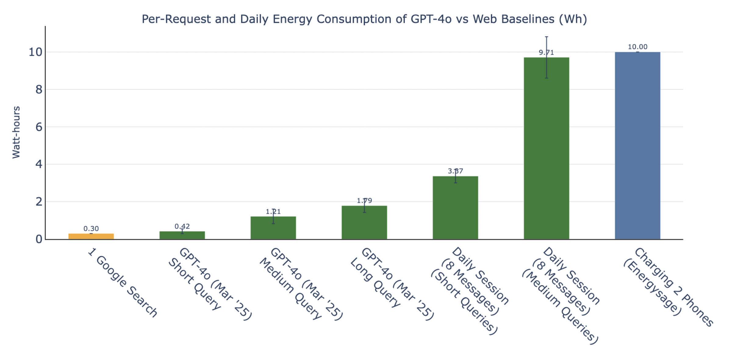 Una mayor huella energética está asociada al uso diario en inferencia, veamos en algunas tablas, procedentes de este estudio, algunos valores cotidianos comparados con los de GPT-42