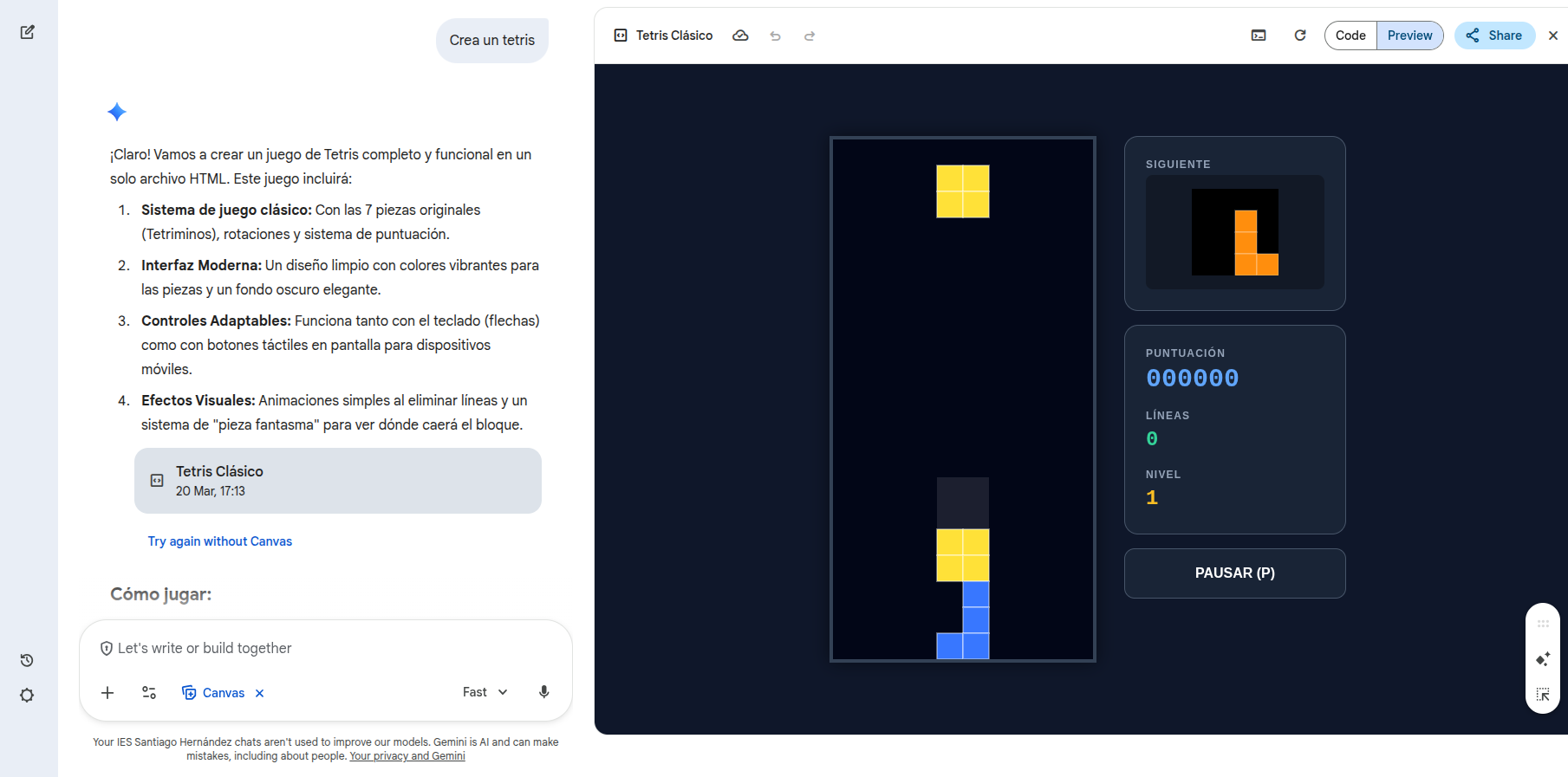 Ventana de uso del modo Canva de Gemini para crear un tetris