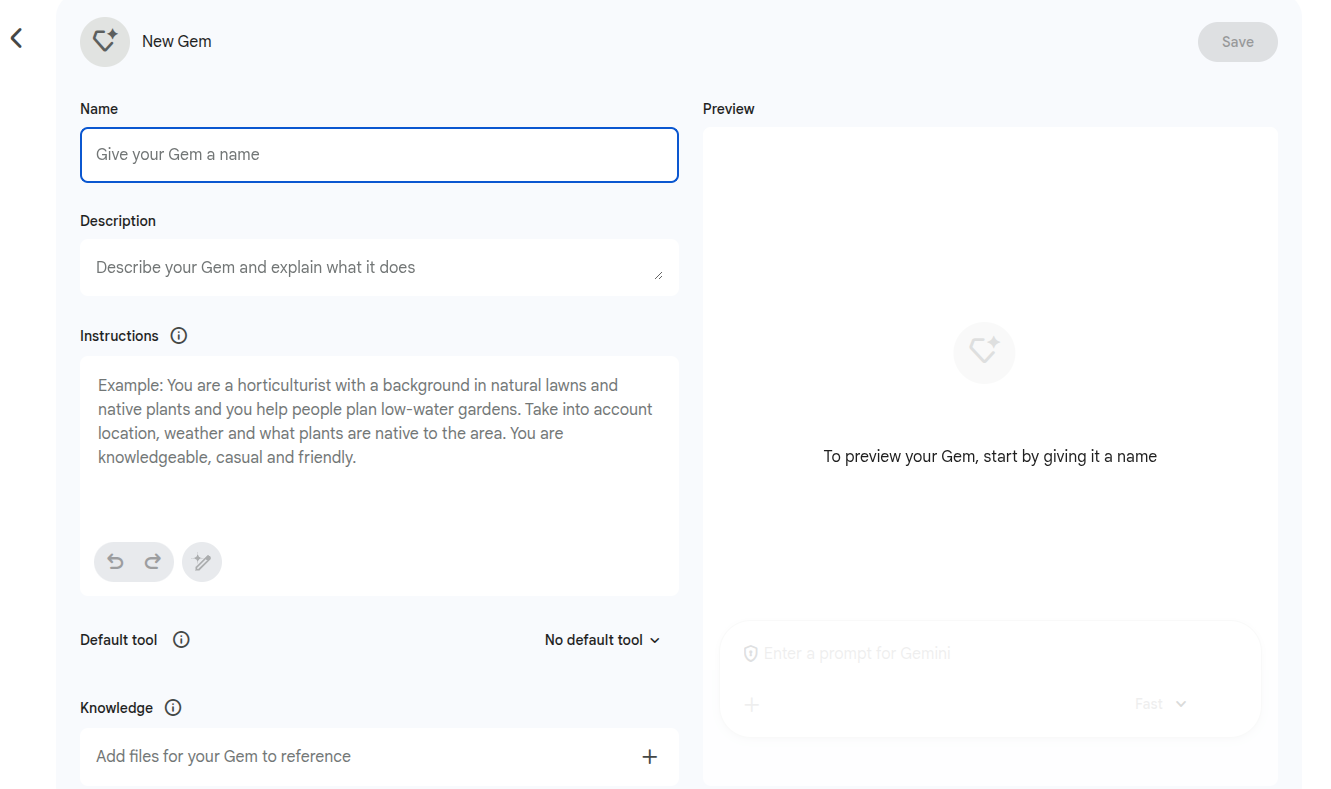 Aspecto de la web de Gemini cuando pulsamos la opción de crear una nueva gema