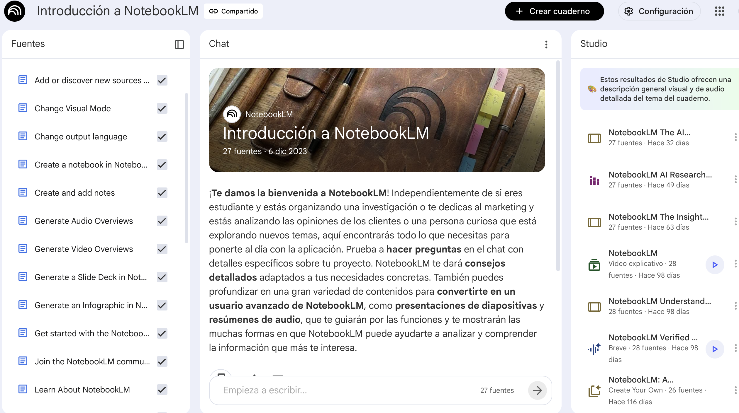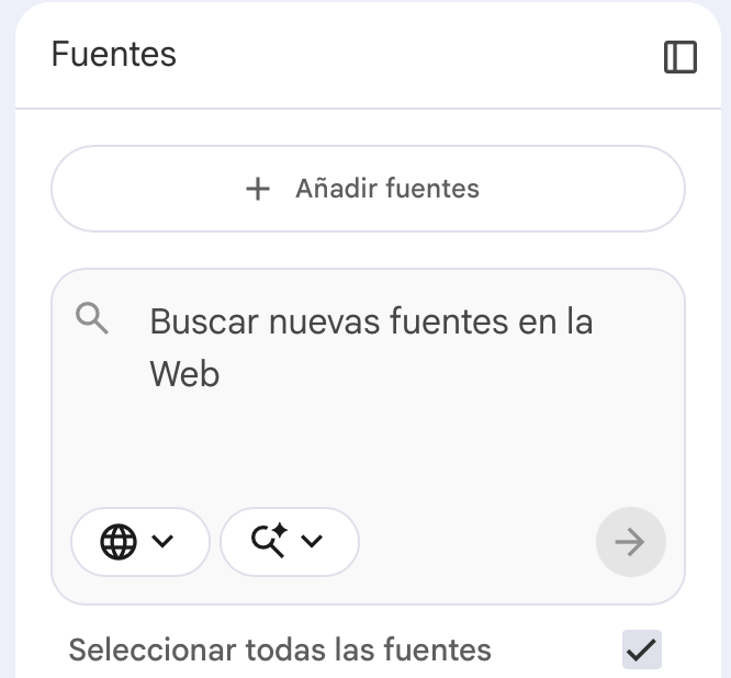 Panel de Fuentes (Izquierda): Aquí es donde subes tus PDF, pegas enlaces de YouTube o seleccionas archivos de Google Drive. "Añadir fuente": Es el primer paso; sin fuentes, no hay contexto.