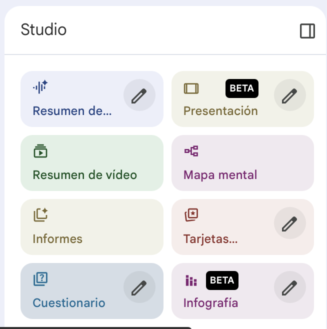 NotebookLM no solo responde preguntas; puede transformar el formato de tu contenido de forma creativa a través de un podcast, resumen de vídeo, mapa mental, tarjetas, informes, cuestionarios...
