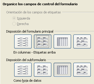 Paso 5: organizar los campos de control. Cada control en un formulario consiste en dos partes: etiqueta y campo. En este paso de la creación del formulario se determina dónde se colocan las etiquetas en relación con los campos. Las cuatro posibilidades, de izquierda a derecha son En columnas–Etiquetas a la izquierda, En columnas–Etiquetas arriba, Como hoja de datos y En bloques-Etiquetas arriba.