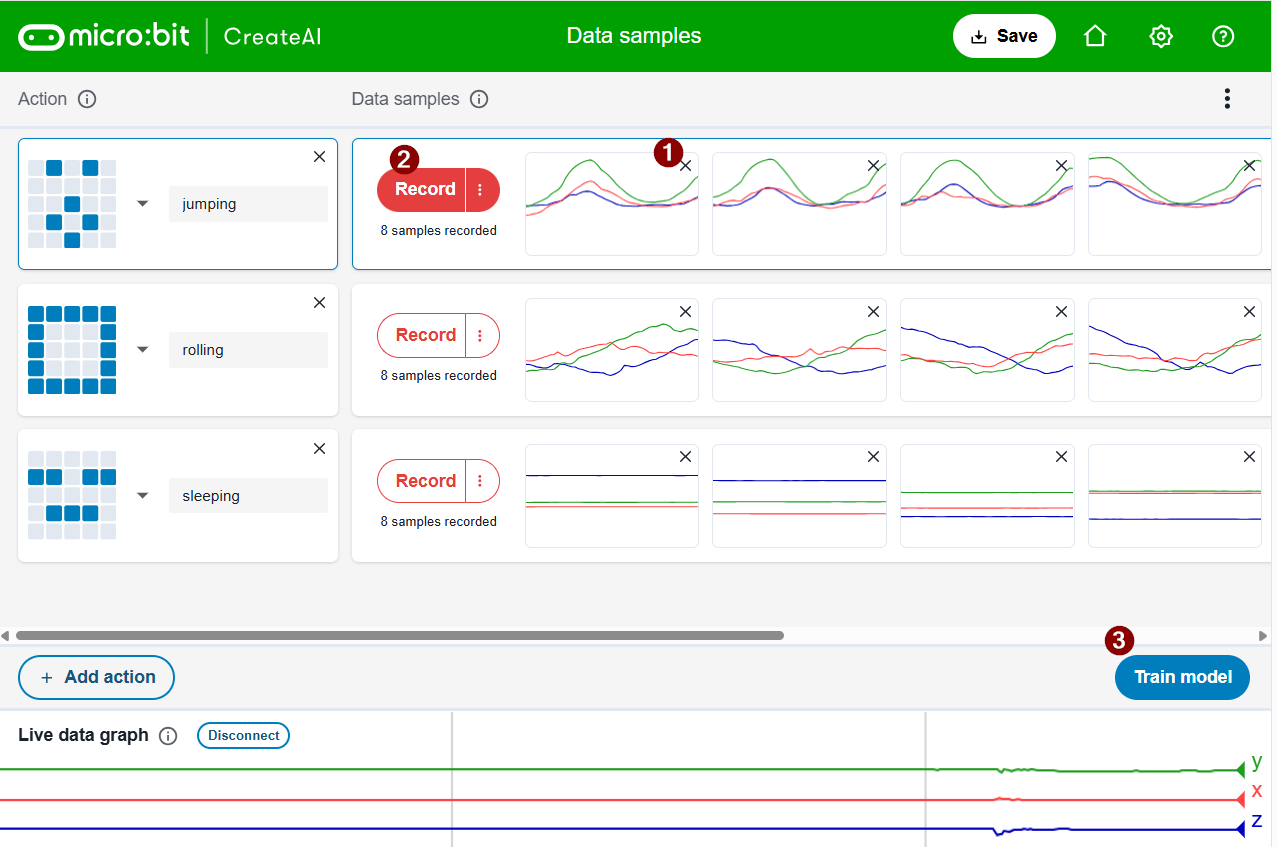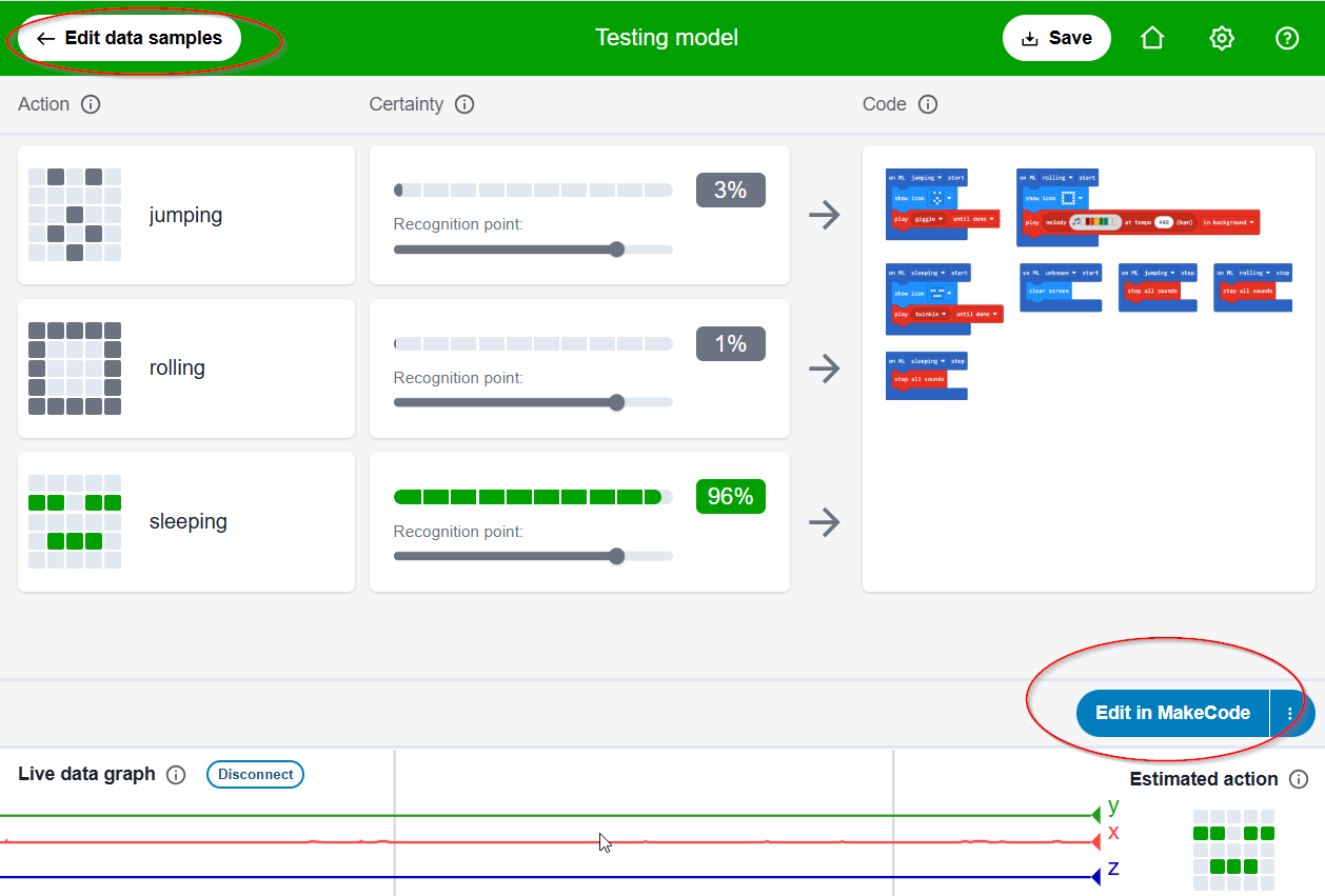 Test model lo testeamos si realmente funciona y la damos a Edit in MakeCode, si no funciona bien pues atrás a Edit data samples