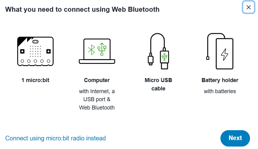 En la siguiente pantalla da preferencia al uso de una microbit y conexión Bluetooth