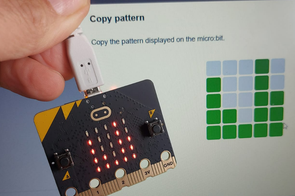 Nos pide reproducir el patrón de la pantalla (esto se debe para asegurarse que sólo se comunica con ese micro:bit, por si hay otros micro:bits por el aula) lo normal es que coincida, por lo tanto no hay que hacer nada, en caso contrario con el ratón hay que reproducir el patrón que refleja la micro:bit