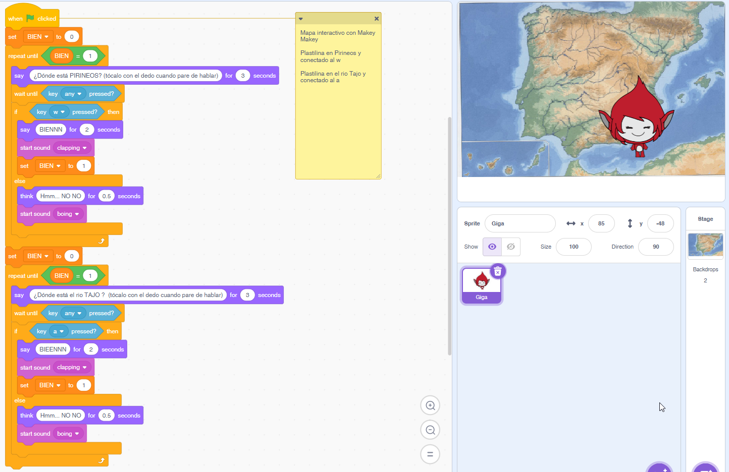- Una plastilina en Pirineos lo conectamos al W del Makey Makey