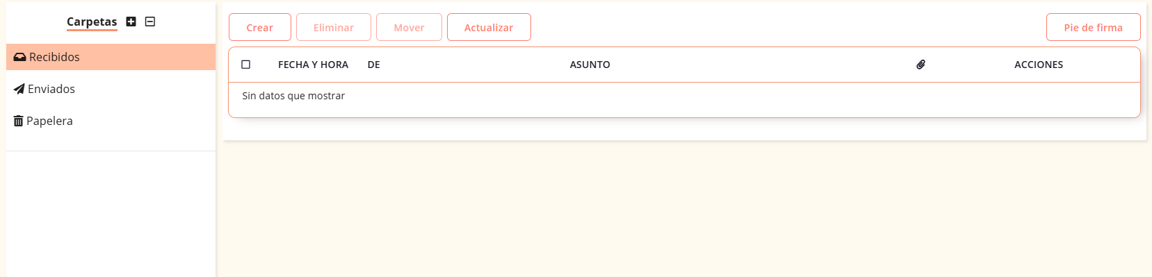 Al entrar en el módulo aparece una pantalla similar a las de los programas o webs de correo electrónico donde por un lado a la izquierda se muestran las diferentes carpetas que tiene esa cuenta y a la derecha se muestran los mensajes existentes en la carpeta seleccionada.