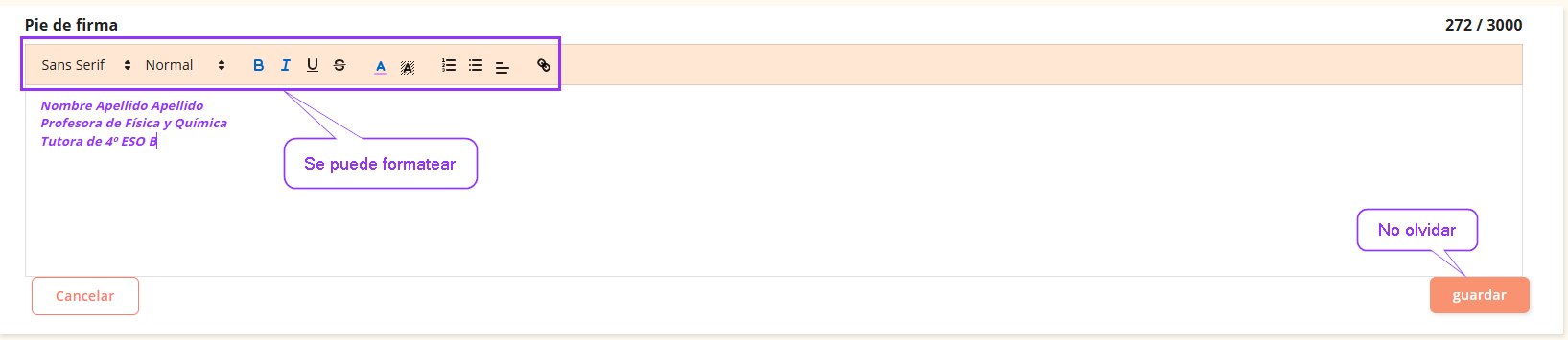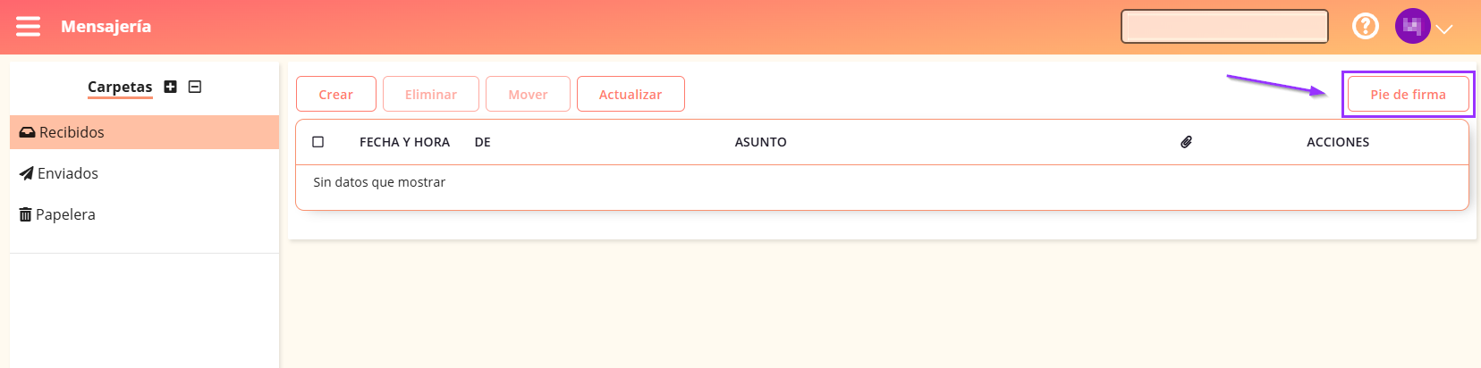 Se puede incluir una firma en la mensajería similar a otros gestores de correos. En la parte superior derecha nos encontramos con el botón “Pie de firma”: