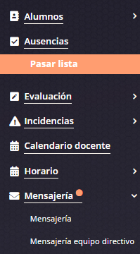 En el menú mensajería, para usuarios con rol Equipo directivo, se muestran dos submenús: Mensajería (igual al resto de roles) y Mensajería equipo directivo (explicada en este apartado).