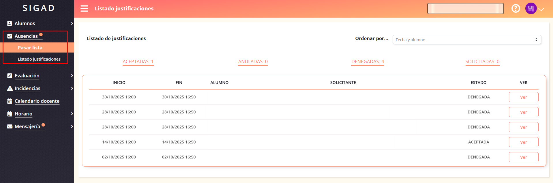 - Estado, fecha y alumno: Ordena primero por estado, siguiendo el criterio anterior, y posteriormente por fecha y alumno.