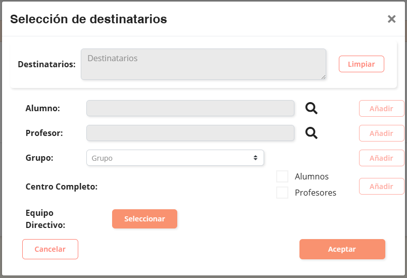 de selección de destinatarios (igual a la del otro submenú, excepto que no hay desplegable de materia).