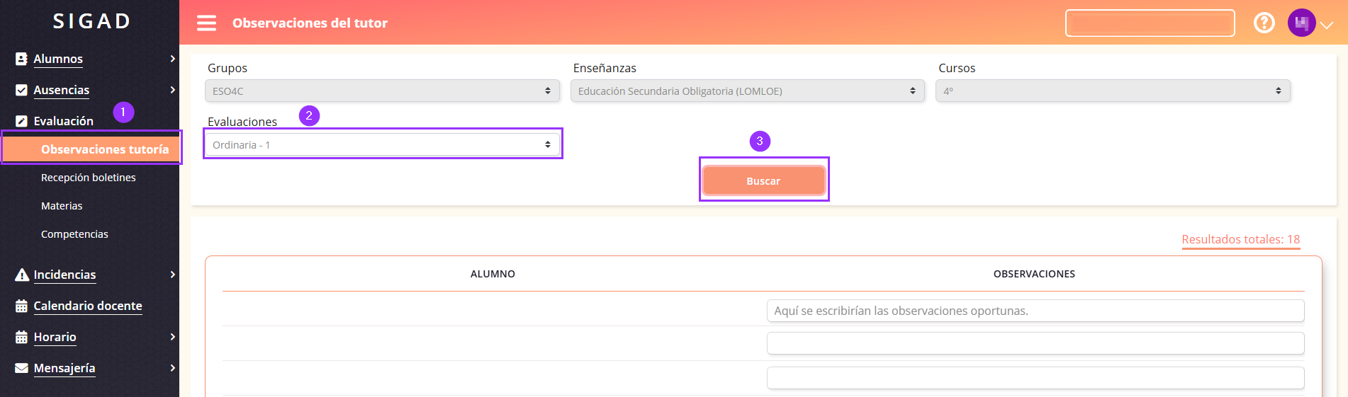 Nota: Aunque se incluyan observaciones de tutoría, puede que no se muestren en el boletín. Esto es debido a que se requiere que haya al menos una materia con calificación para que se reflejen en el boletín.