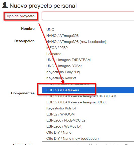Abrimos Steamakerblocks un nuevo proyecto y elegimos la placa ESP32 STEAMAKER