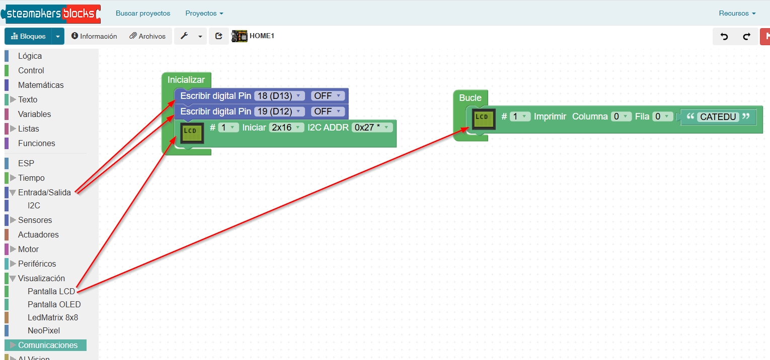 Escribimos este programa simple, que apaga al inicio el ventilador y en bucle representa la palabra CATEDU (también se podría poner en el bloque inicializar) https://www.steamakersblocks.com/web/project/2519579