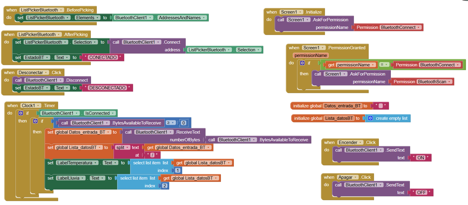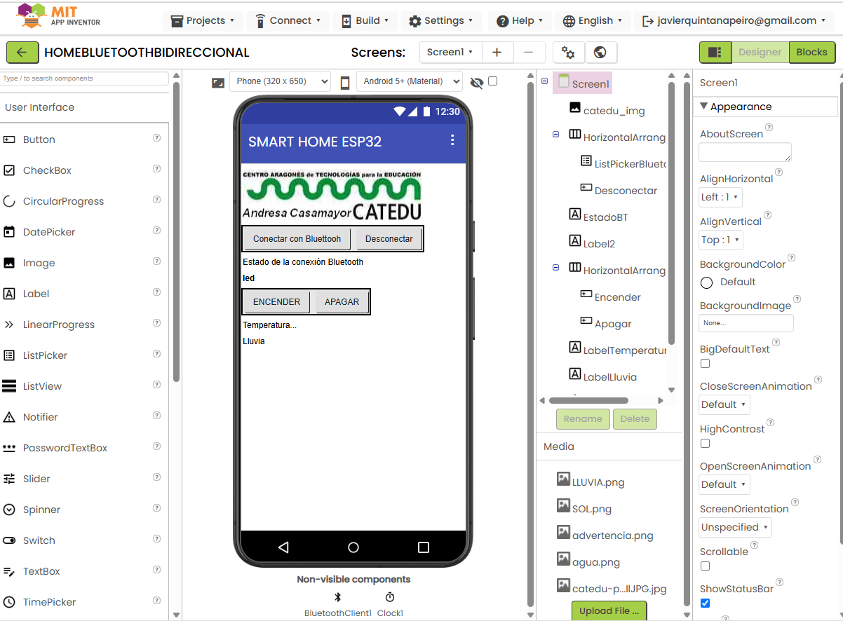 La comunicación con la placa en este caso no es tan sencilla como en el caso anterior, no nos vale las APPs que hay en Google Play que envían un código y en paz, ahora tenemos que tener una APP que si reciben un código que hagan algo. Esto ya es exclusivo por lo tanto hay que programar una APP que cumpla los requisitos. En nuestro caso lo hemos hecho en APP INVENTOR https://appinventor.mit.edu/