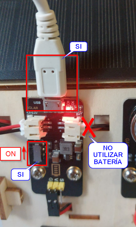 - otro en la interface Solar USB Charging Module con un cargador de móvil para alimentar la maqueta y para no estar todo el rato enchufando y desenchufando cables