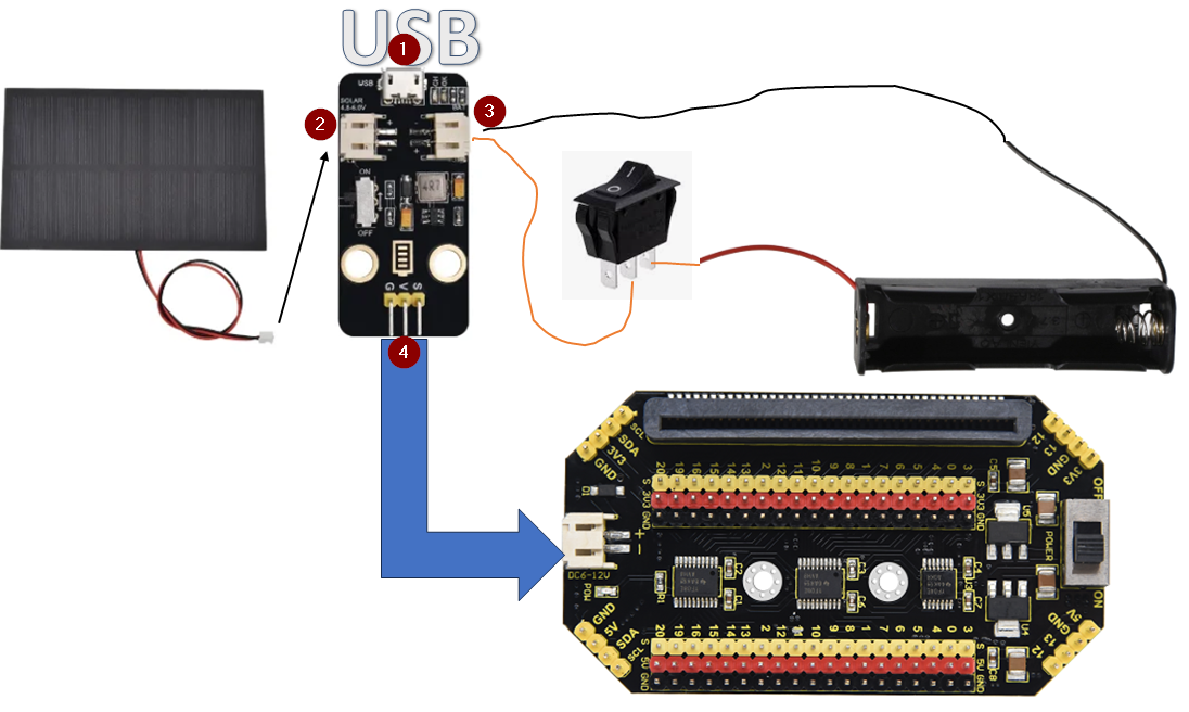 La placa solar, la batería y el puerto USB se conectan a través de la interface PH2.0MM Solar USB Charging Module (ver foto anterior)